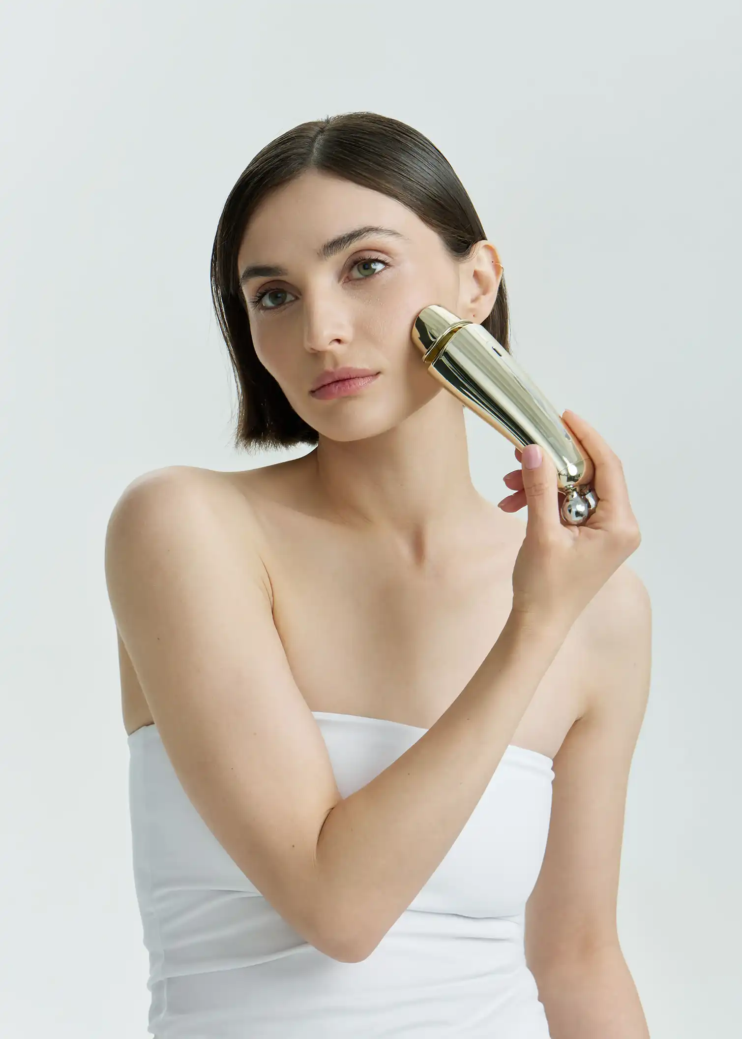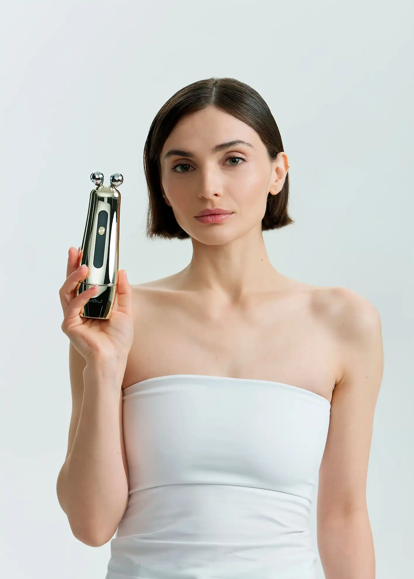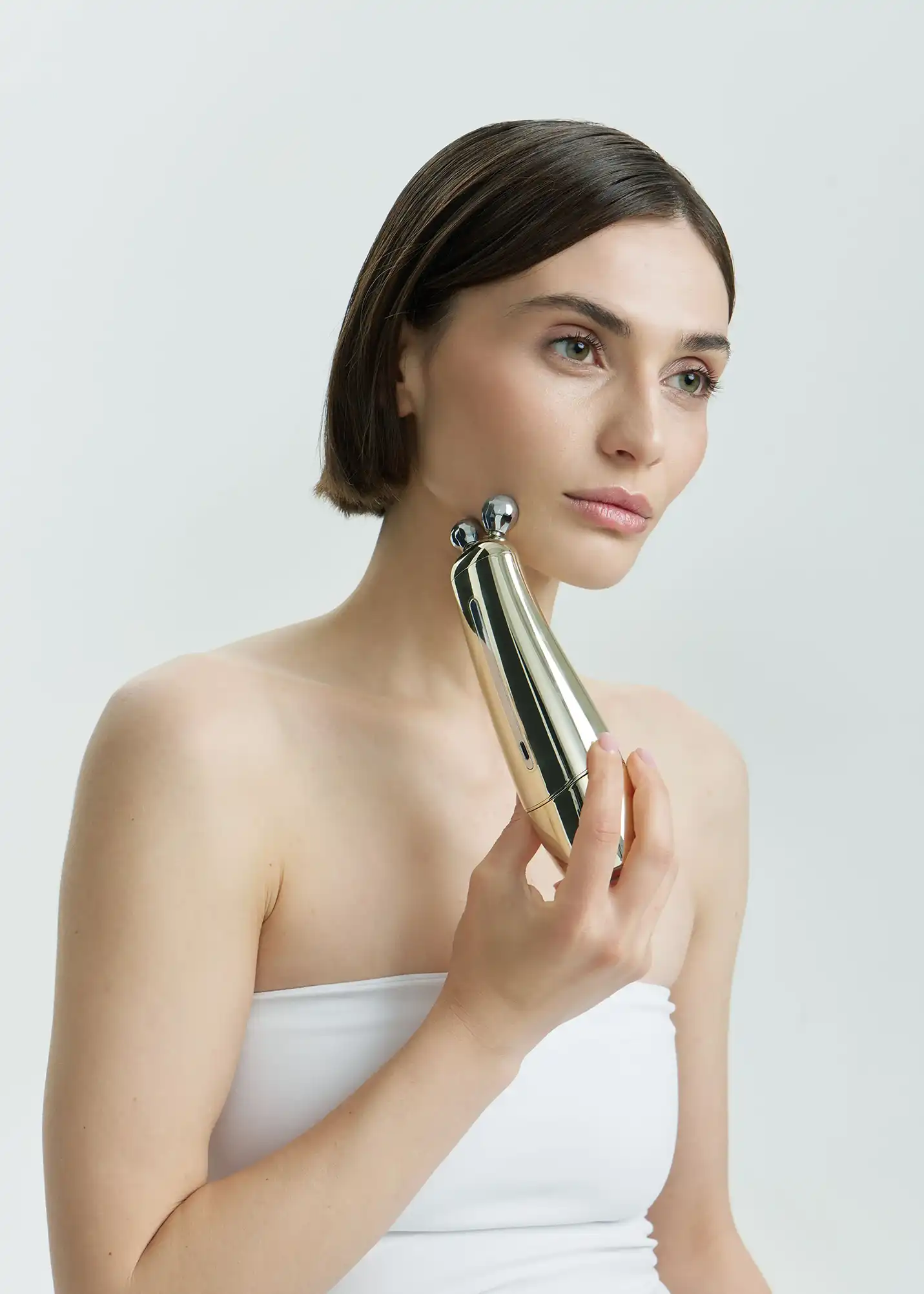 - Режим EMS: нанесите гель, выберите уровень интенсивности, подтягивайте кожу снизу вверх