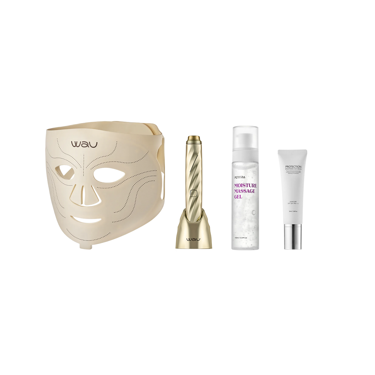 Набор объединяет всё для полноценного ухода: от общего преображения до точечной коррекции. LED-маска улучшает состояние кожи световой терапией, а компактный девайс AI NEW целенаправленно работает с областью вокруг глаз. Процедуры усиливает проводящий гель, а лёгкая сыворотка с SPF 50 завершает ритуал, обеспечивая защиту
