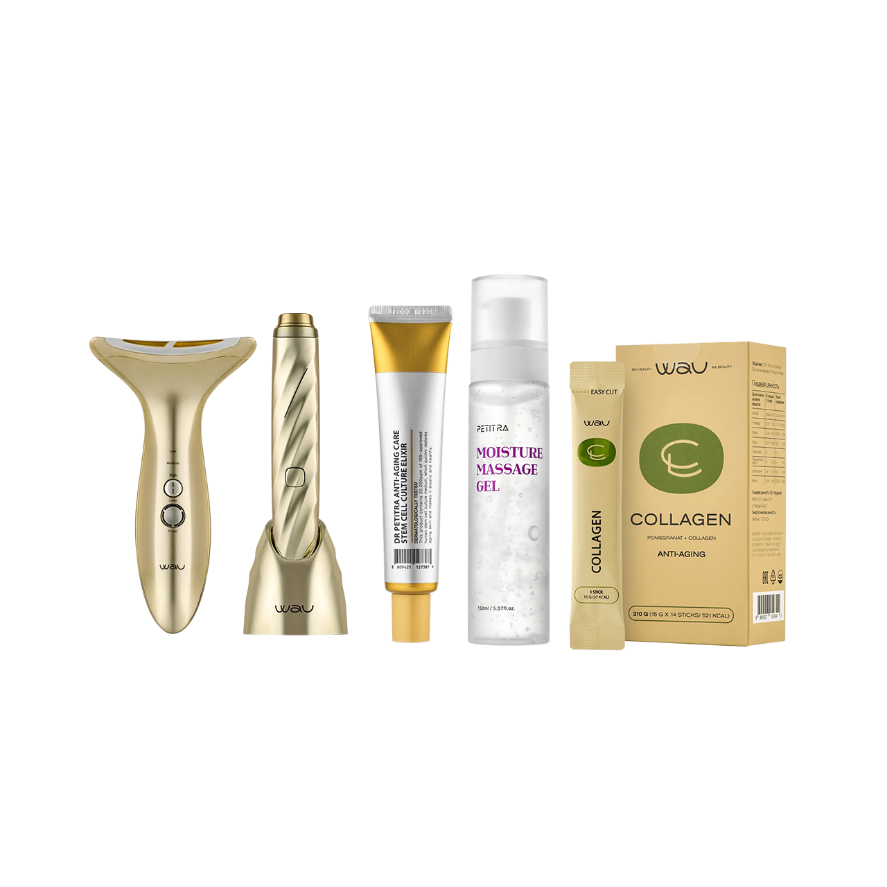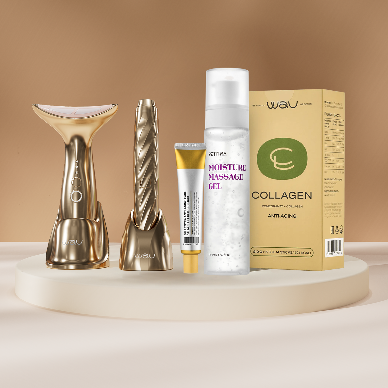 Эксклюзивная система омоложения, где каждый элемент усиливает действие другого: аппаратное воздействие на лицо и зону глаз, глубокое восстановление кожи, стимуляция выработки коллагена