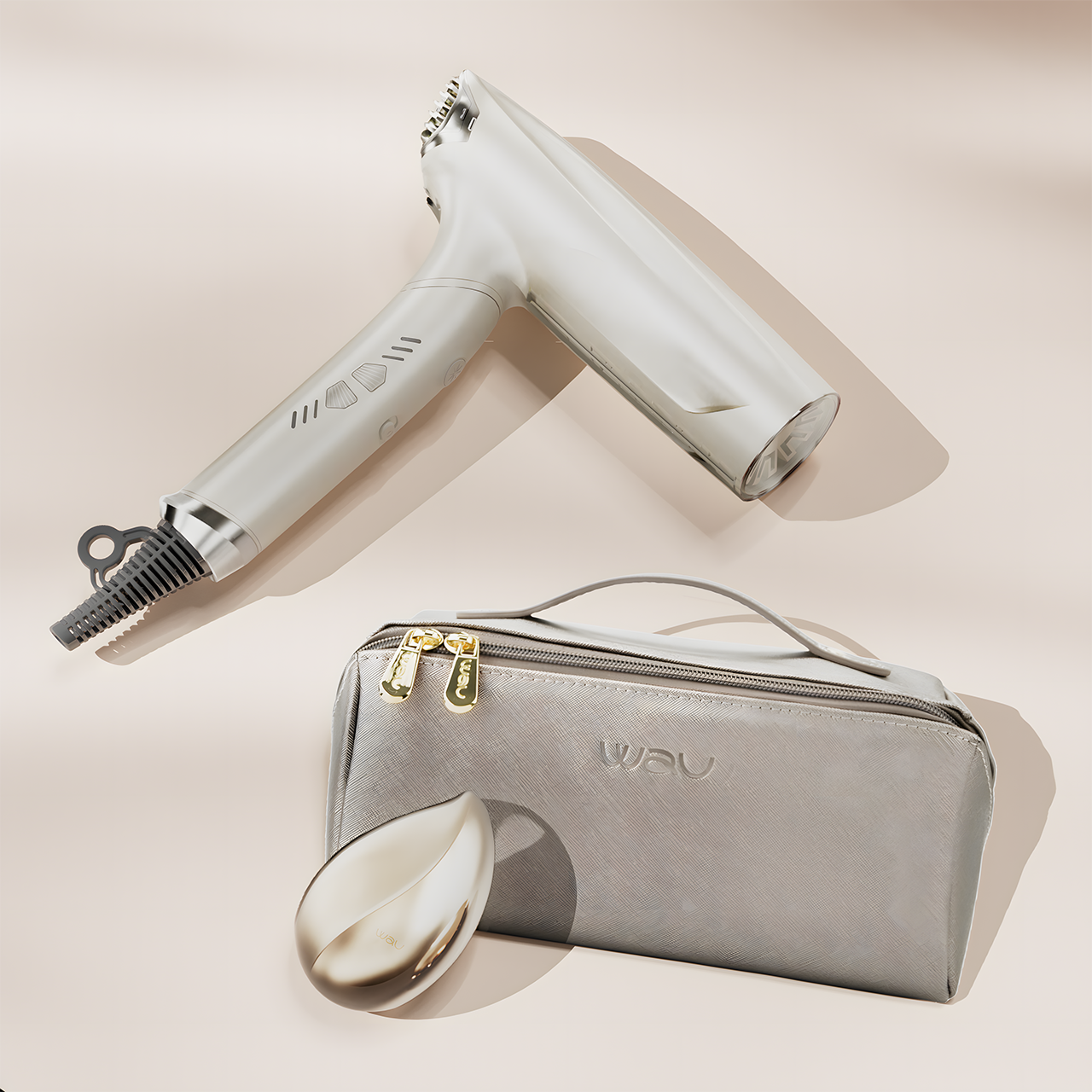 YUTO — современный фен для бережной сушки и укладки, а GOLDEN LEAF — стильная расческа легко распутывает волосы и подходит для массажа кожи головы. Вместе они создают идеальный дуэт для здоровья и красоты ваших волос. RENGA — стильная косметичка для хранения набора дома и в путешествиях.